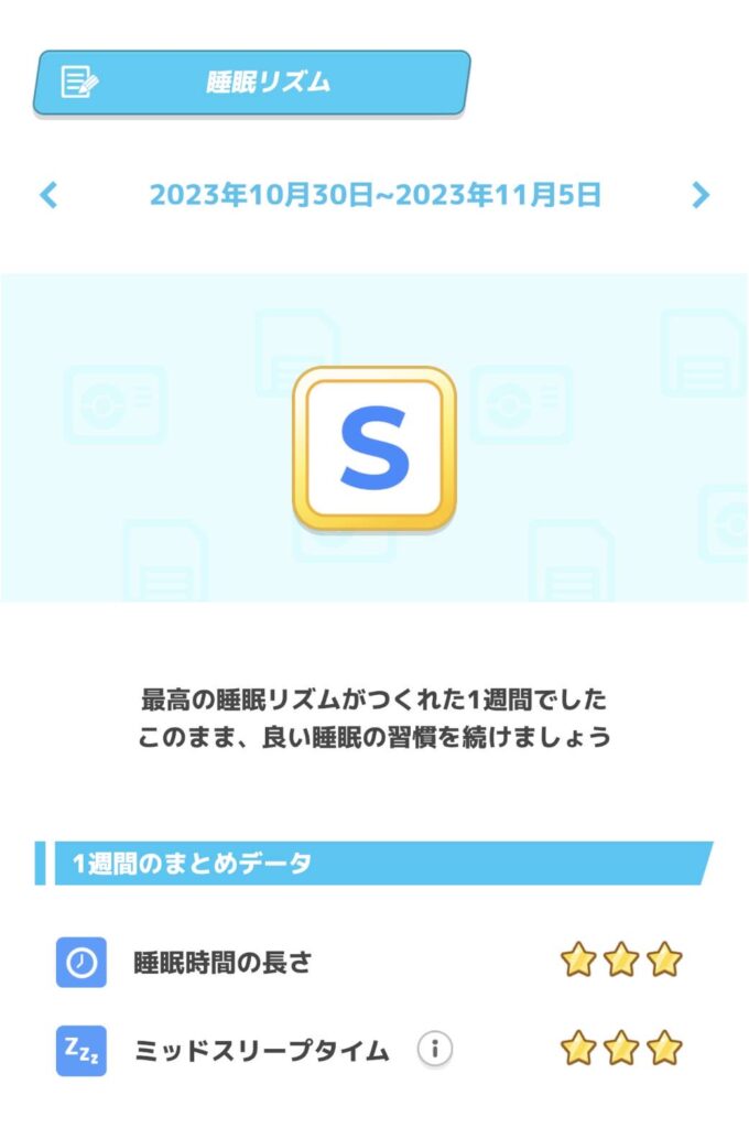 ハム公はもともとポケモンファンですので、リリースして最初の週からいろんなポケモンに会いたくて欠かさず計測をするようになりました。ポケスリはその日の睡眠スコアだけでなく、週全体の睡眠リズムの評価もしてくれます。**この週睡眠リズムで高評価を目指すのが、睡眠と体調改善のポイントです。**A以上を得るには、たくさん睡眠時間を取るだけでなく、寝入りと寝起きの時間をできるだけ揃える必要があります。