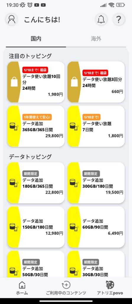 SIMをアクティベートしたので早速利用開始です。Povo2.0は基本料金がかからず、**必要な時に必要なだけデータ量や通話かけ放題を必要に応じてトッピング(追加)するシステムです。**トッピングはデータ量だけではなくDAZNやsmash.等のコンテンツの使用も選択できます。