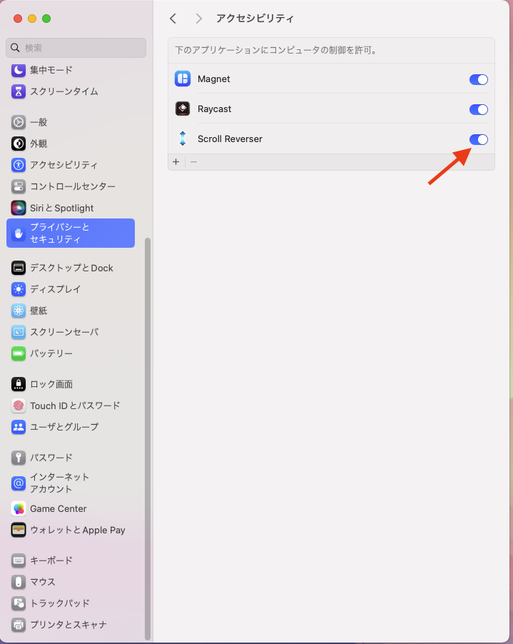 「システム設定」>「プライバシーとセキュリティ」>「アクセシビリティ」を開き、Scroll ReverserのスイッチをONにして許可します。