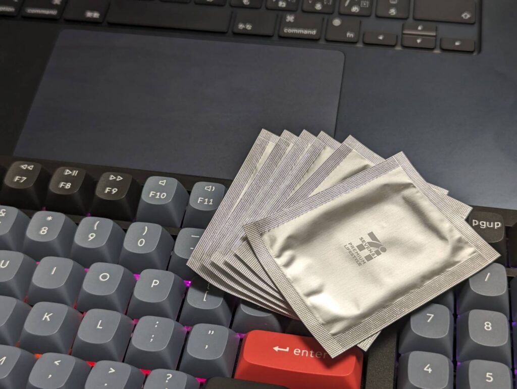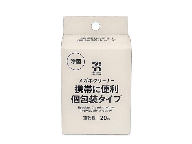 ガジェットを吹くのには個包装タイプクリーナーもおすすめです。僕は「**7PL サッと拭くだけメガネクリーナー20包」**を愛用しています。こちらはセブンイレブンで売ってる個包装のメガネクリーナーで、程よい湿り気で手垢や皮脂をしっかり落とせます。セブンイレブンならほぼ必ず置いてる商品ですので、手に入れやすいのも魅力です。