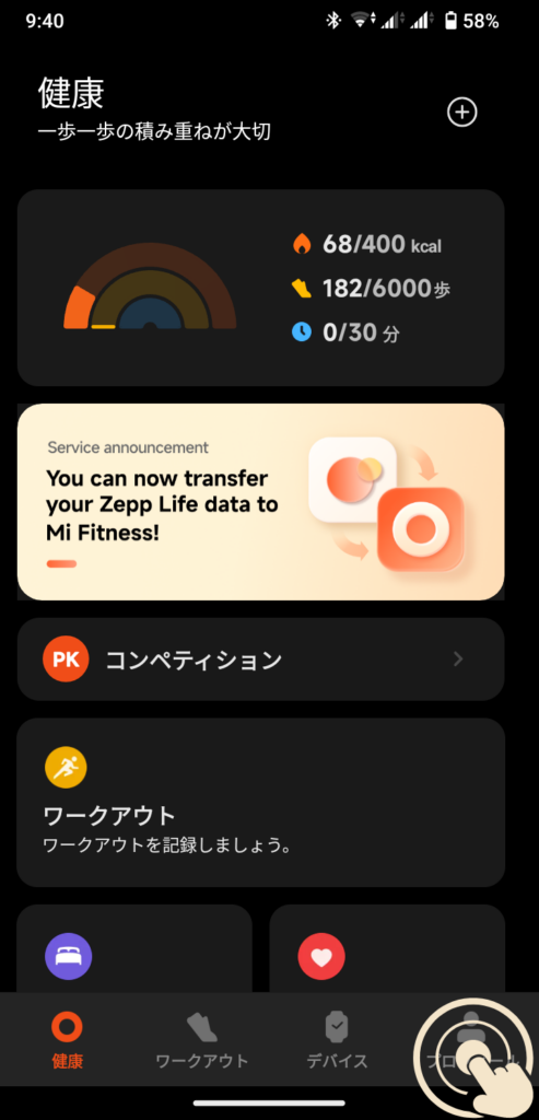 STEP 1: Mi Fitnessアプリで「プロフィール」を開く