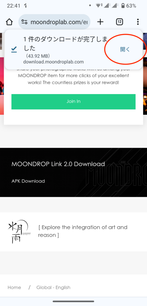 次に、ダウンロードしたAPKファイルをインストールします。先ほどのダウンロード完了通知の「開く」をタップしてください。
