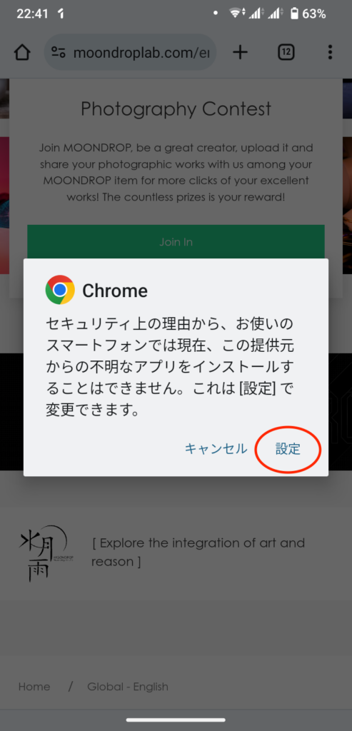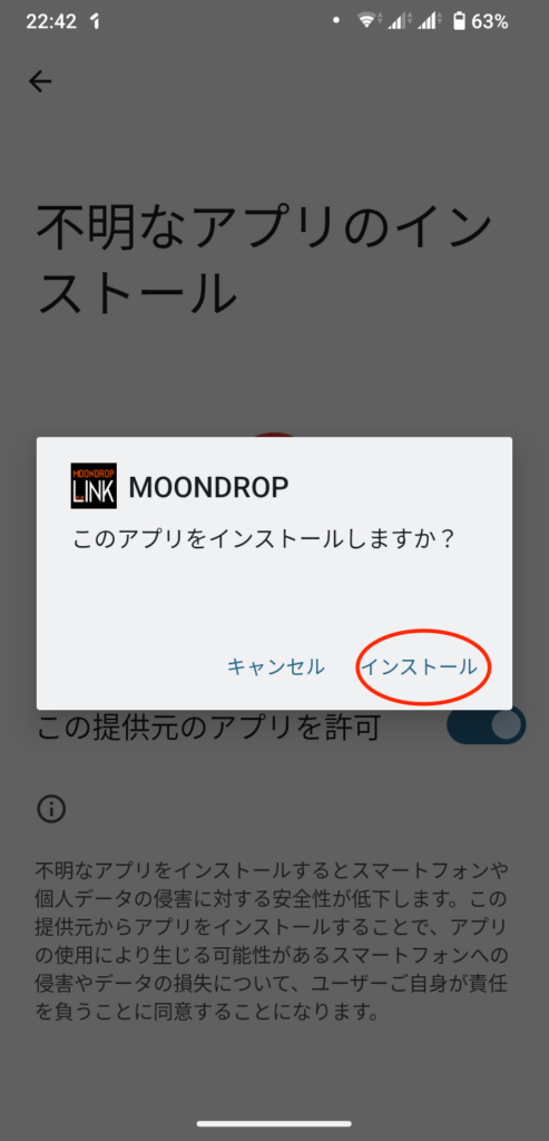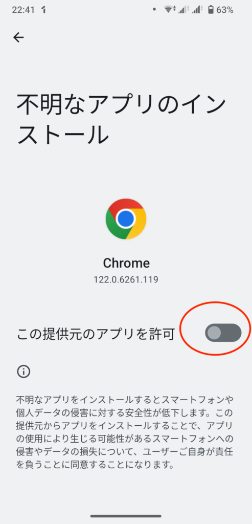 「この提供元のアプリを許可」のスイッチをオン(有効)にします。今回はChromeでダウンロードしたので、Chromeからのインストールを許可する設定になります。