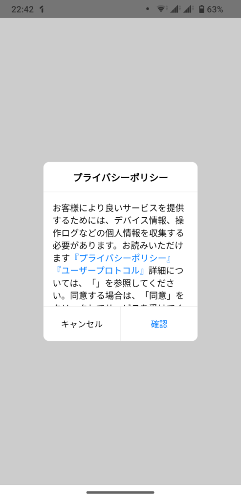プライバシーポリシーが表示されるので、内容を確認して「確認」をタップします。