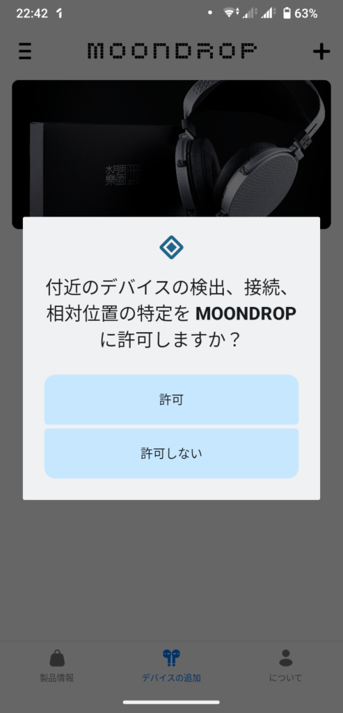 次に、イヤホンとの接続に必要な「位置情報」と「付近のデバイスの検索」の権限を求められます。アプリの利用に必要なので、それぞれ許可しましょう。