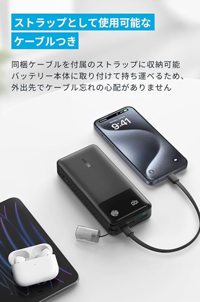 Anker Power Bank (20000mAh, 30W)価格(税込み)¥5,990(数量限定**¥4,790**)サイズ約151 x 71 x 28mm 約 485g入力USB-C 入力 :5V⎓3A/ 9V⎓3A / 15V⎓2A / 20V⎓1.5A (MAX 30W)出力USB-C 出力5V = 3A / 9V = 3A / 10V = 2.25A / 12V = 1.5A / 15V = 2A / 20V = 1.5A (MAX 30W) USB-A 出力5V = 3A / 9V = 2A / 12V = 1.5A (MAX 18W)ANKER公式サイトから引用