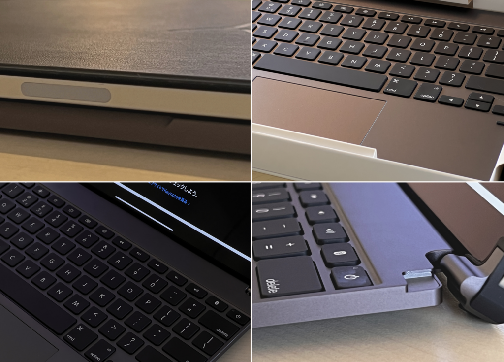 この製品の素晴らしいことの一つにキーボードの作り、打鍵感があります。正直純正のMagickeyboard以上に使いやすく、Macbookのキーボードに近いストロークの深さと、打ち心地がありました。上記のトラックパッドのデメリットもキーボードショートカットで対応すればいいと考えていたくらいに全体としての魅力度が高いです。