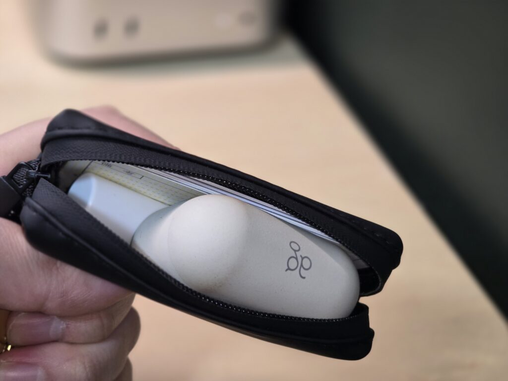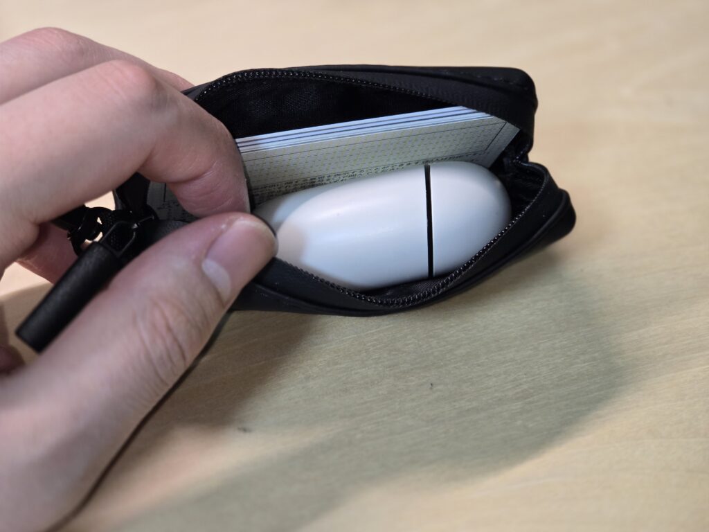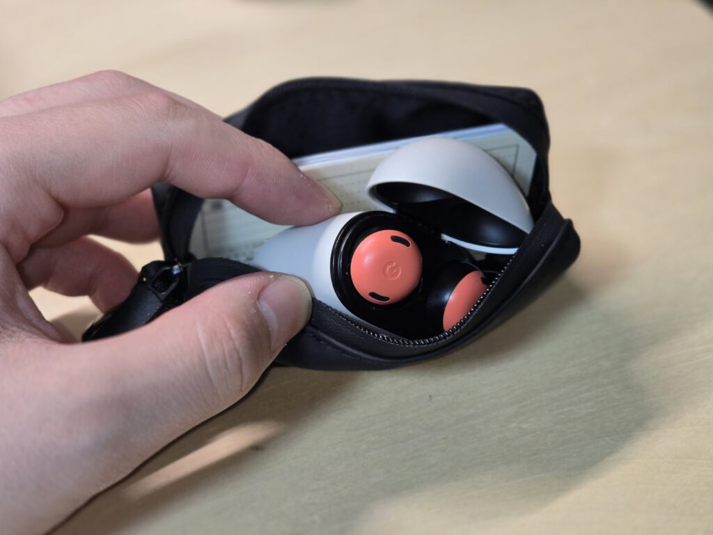次に、ガジェット好きとして試さずにはいられない、ワイヤレスイヤホンの収納に挑戦です。比較的大型な僕の愛機、Google Pixel Buds Proを入れてみます。