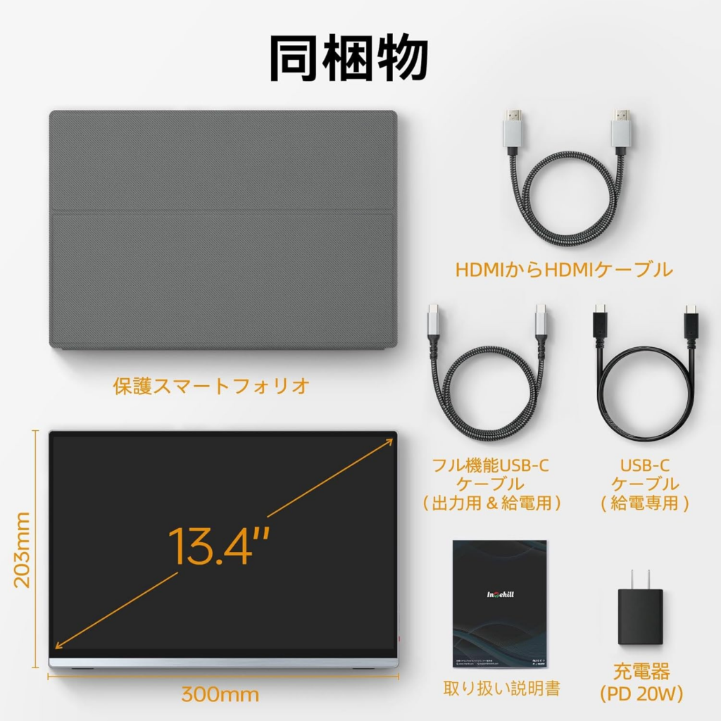 型番U13ZAパネルサイズ13.4インチアスペクト比16:10表面処理**ノングレア(非光沢)**解像度3840 x 2400 (WQUXGA)色域sRGB 100%映像入力端子USB Type-C (Alt Mode) x2, フルHDMI x1USBポートUSB Type-C (給電専用) x1消費電力最大約15W (PD 45W以上推奨)